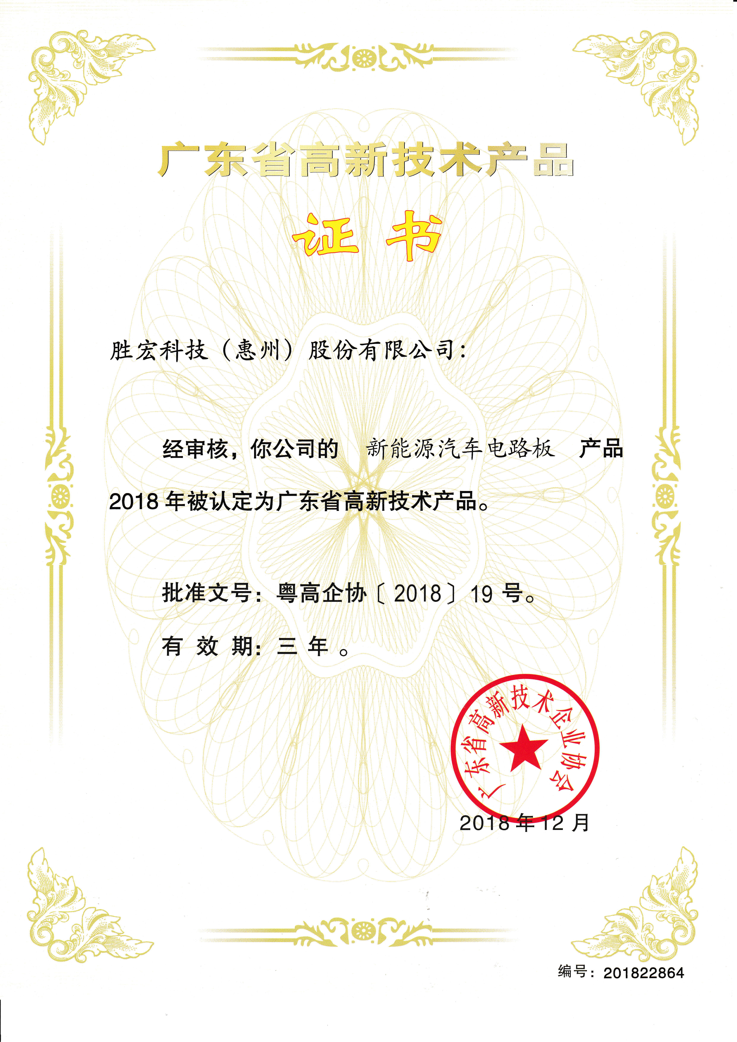 “新能源汽车电路板”高新技术产品证书