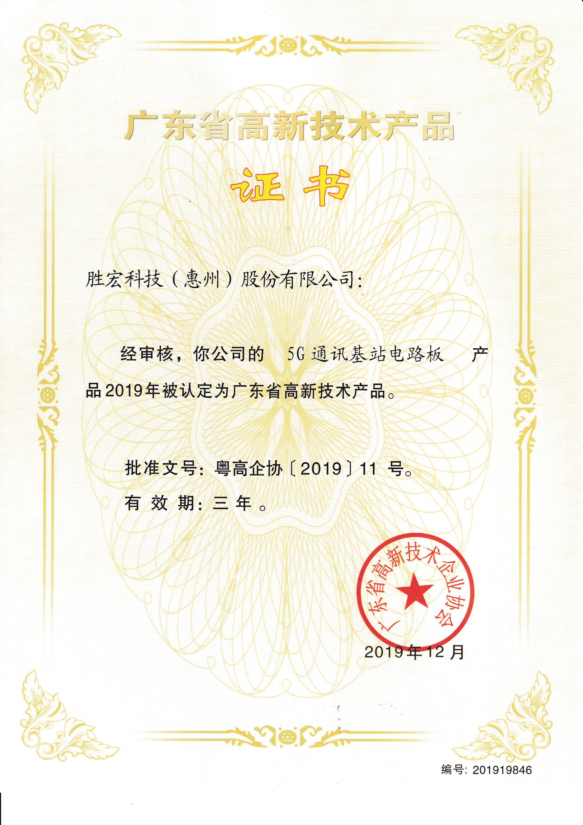 “5G通讯基站电路板”高新技术产品证书